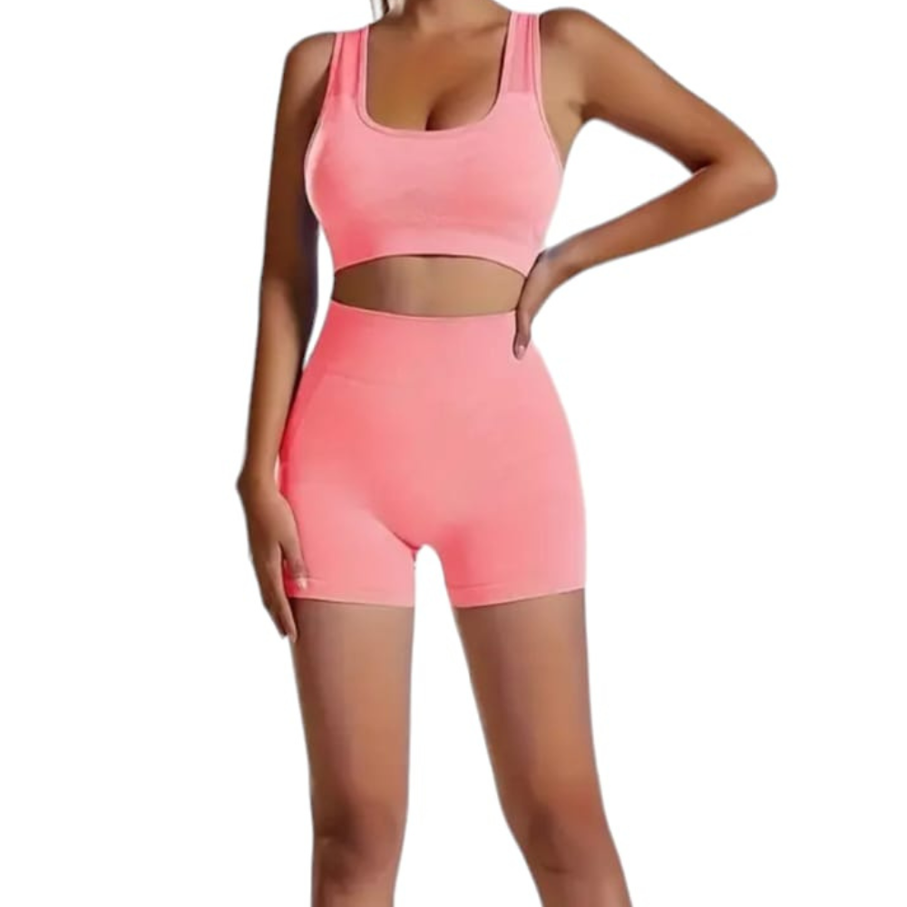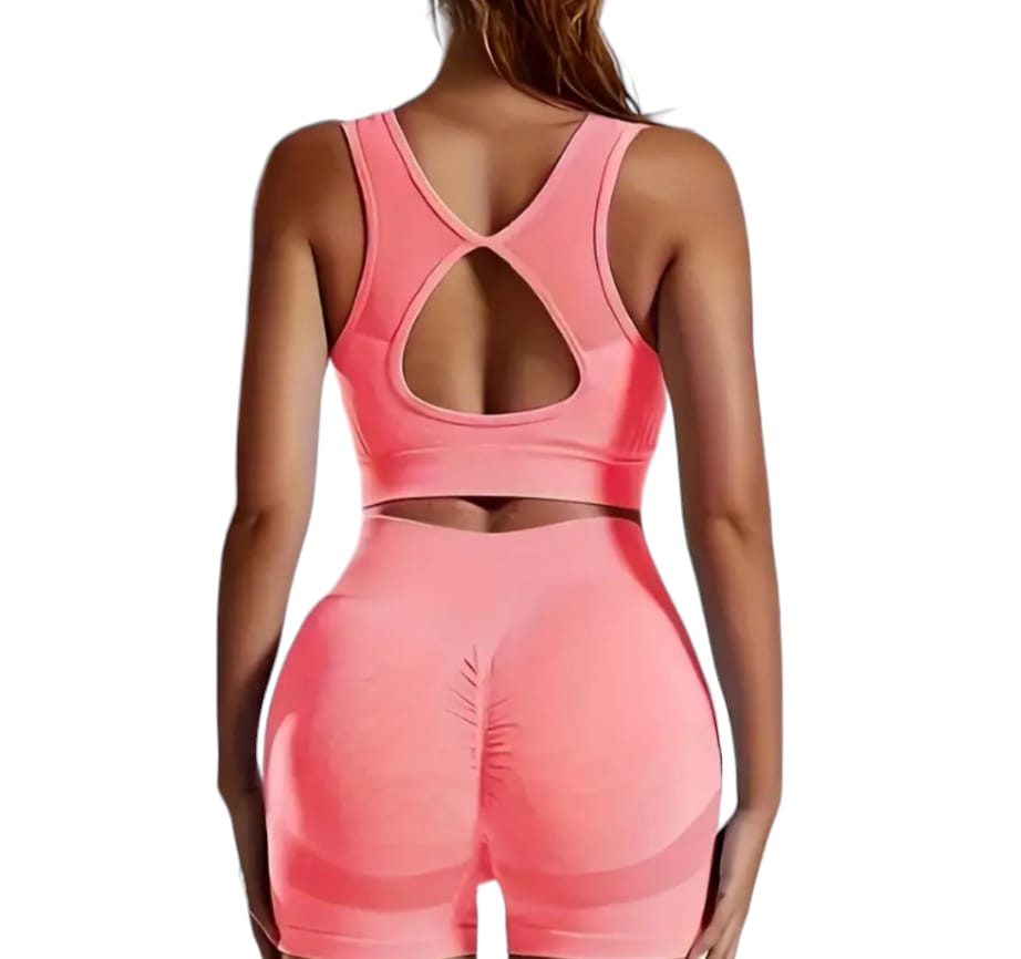 Contine: O bustiera cu decupaj pe spate si o pereche de pantaloni scurti cu talie inalta care acopera micile imperfectiuni.