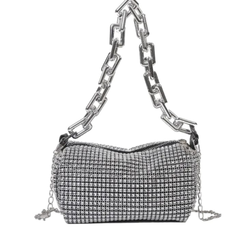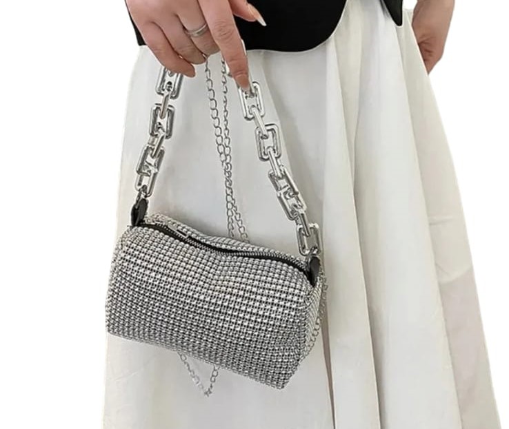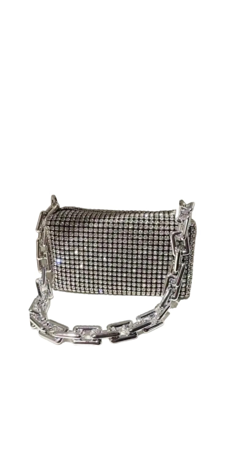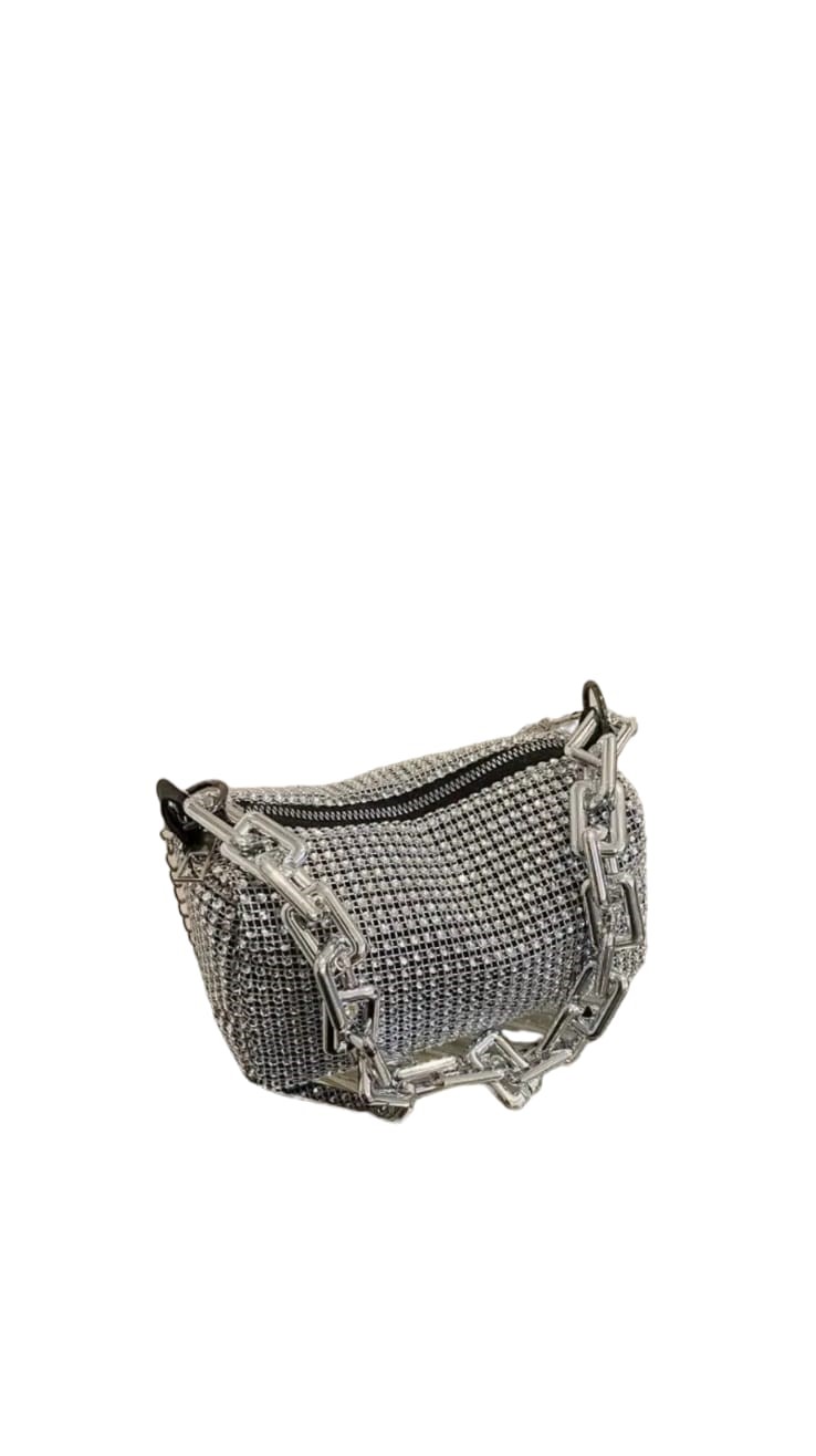 Geanta de dama, culoare argintiu cu strasuri  ce vine cu o curea detasabila ce va permite sa o purtati pe umar sau ca un plic elegant.